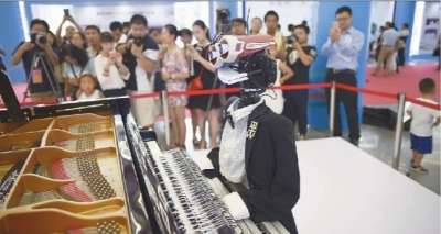 “We are the champion……”展示厅里,身着黑色西装的机器人“TEO”端坐在钢琴前,边弹边唱,还不时向观众做出俏皮的表情。这款名叫“TEO”的机器人由一家意大利公司设计制造,曾公开演奏过《华丽大波兰舞曲》《莫扎特钢琴协奏曲》等作品。